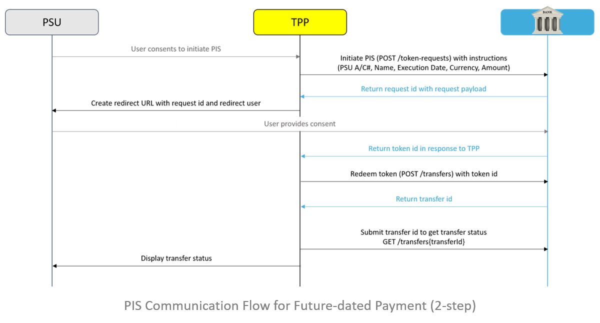 The sequence diagram pictured next shows the communication flow for a future-dated payment.