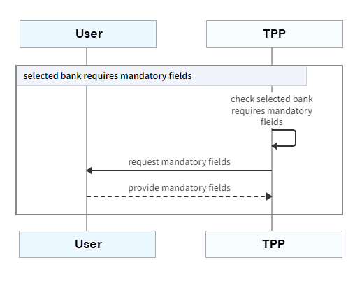After accepting consent from the user, the TPP can check whether the bank selected by the user requires mandatory fields and request them from the user.