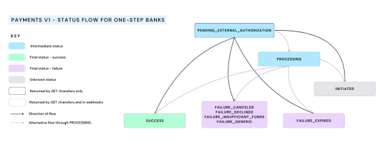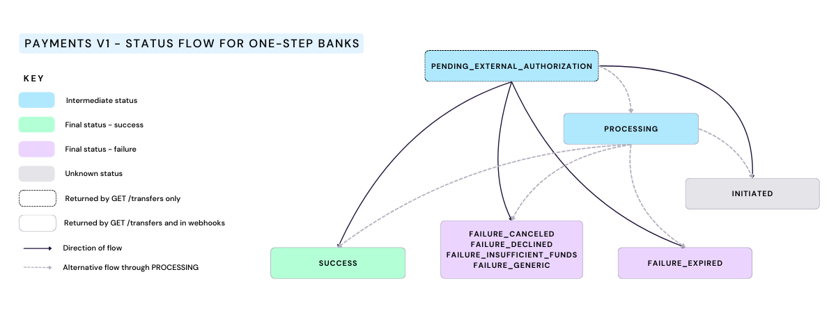 PENDING_EXTERNAL_AUTHORIZATION This status indicates that the user has been sent to the bank to complete the authorization process. If not completed within the allowed timeframe (usually around 15 mins, but there are variations between banks) the transaction will expire and transition to FAILURE_EXPIRED. This status is only relevant for one-step payment flows. Intermediate