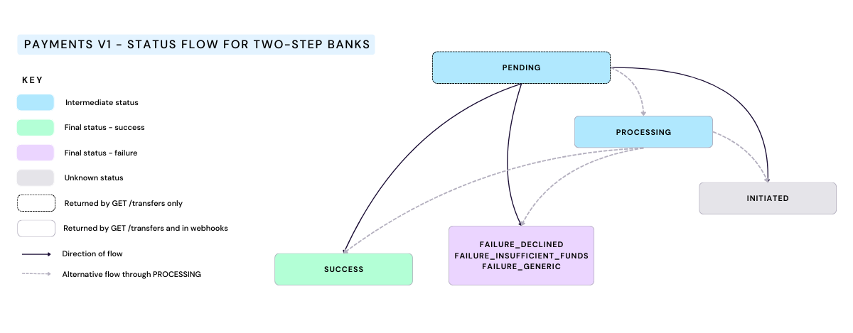 PENDING This status indicates that the user has successfully completed the authorization process with the bank and the transfer is pending redemption. This status is only relevant for two-step payment flows. Intermediate