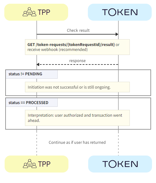 1. TPP -> Token.io - Using the GET /token-requests/{tokenRequestId}/result endpoint, the TPP checks the status of the payment initiation from Token.io.