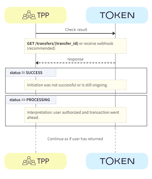 • status = PROCESSED - The TPP should continue as if the user has returned to the redirect URL specified in the Token.io request.