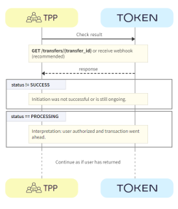 Please be aware that Token.io’sSUCCESS status does not guarantee funds transfer. It merely indicates/confirms the success of a payment initiation. SUCCESS means the final status on the bank’s side has been reached, regardless of whether or not this status is shared with Token.io, and there will be no further updates from the bank. For non-instant transfers, TPPs are strongly advised to look at the combination of statuses — Token.io’s status, as well as the final status from the bank — for a risk-based approach; otherwise, TPPs are advised to rely on end-to-end reconciliation for final status confirmation.