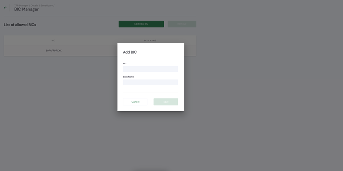 On the BIC Manager page, click the Add new BIC button, then enter the required information: BIC, Bank Name.