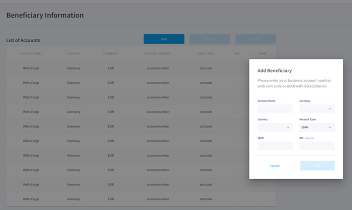 Once saved, beneficiary accounts in the list are available as transfer destinations for the payments you initiate by specifying the Account Number/IBAN and optional BIC, as appropriate.