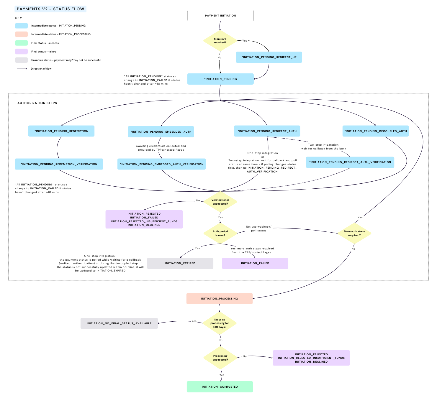 The payment status is polled while waiting for a callback (redirect authentication) or during the decoupled step. If the status is not successfully updated within 30 mins, it will be updated to INITIATION_EXPIRED.