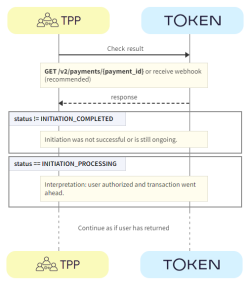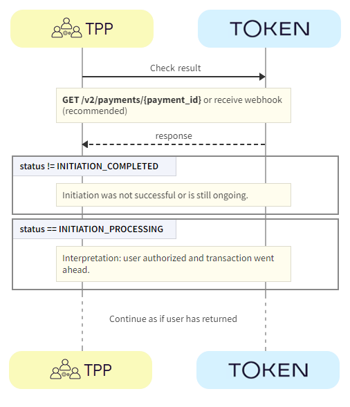 Additionally, the callback may not be sent if, for example, the user successfully logs in, approves the payment and then closes the browser page too early, or there are some other connection issues. The transaction may have completed and funds may have been transferred, but the user hasn't been redirected from the bank page and the TPP didn't receive the callback. In these cases, we recommend continuing to watch the payment status updates via webhook, or by polling the payment, until the status is finalised.