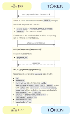 Token.io recommends that TPPs subscribe to webhooks to receive payment status updates. As a fallback, TPPs can also poll Token.io for the current status of an initiated payment request.