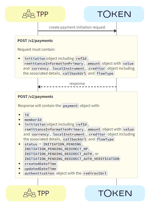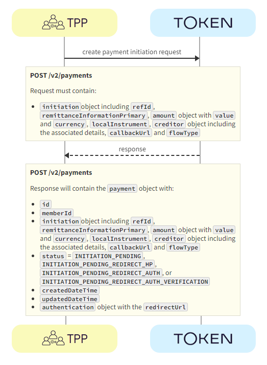 1. TPP -> Token.io - The TPP creates the payment initiation request using the POST /v2/payments call.