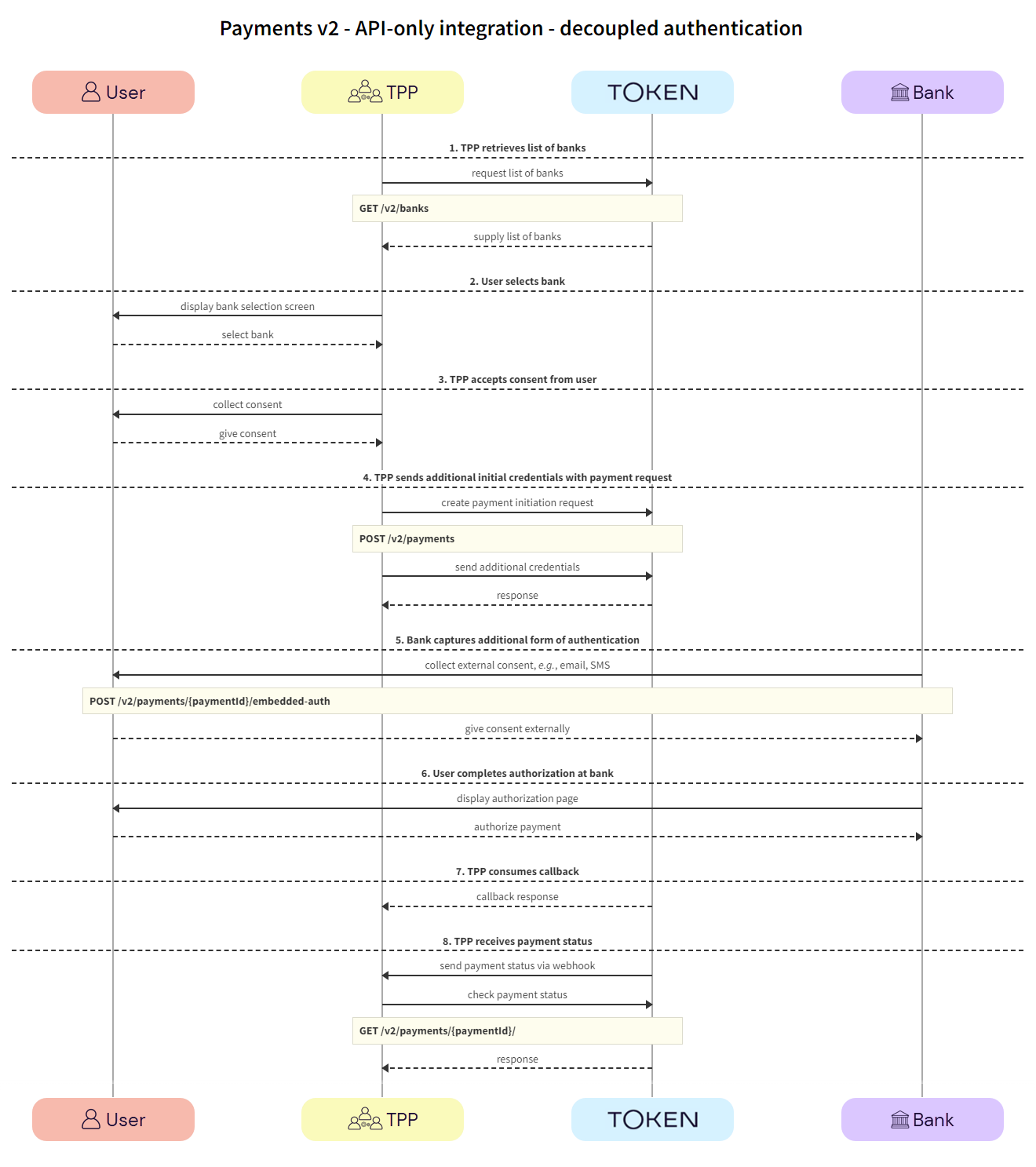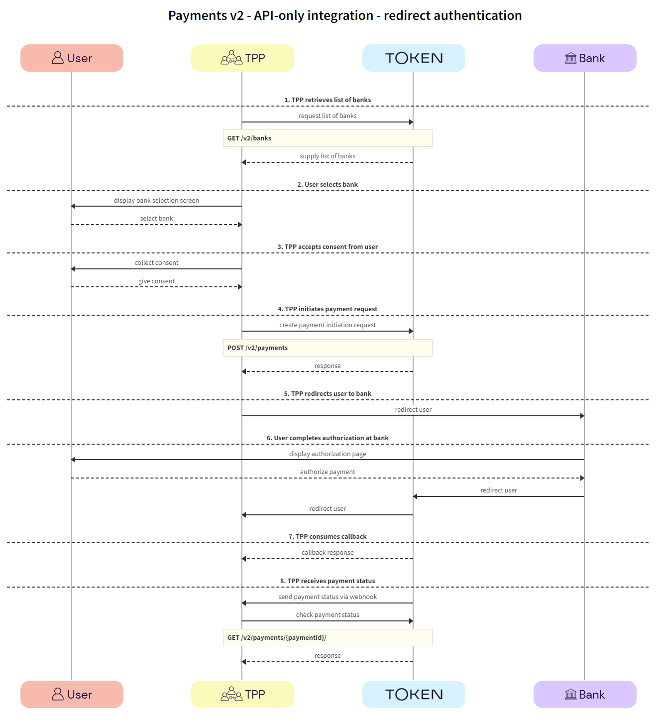 This section describes the API integration where the TPP owns the full user experience. We recommend that TPPs use webhooks to receive notification of the payment status.