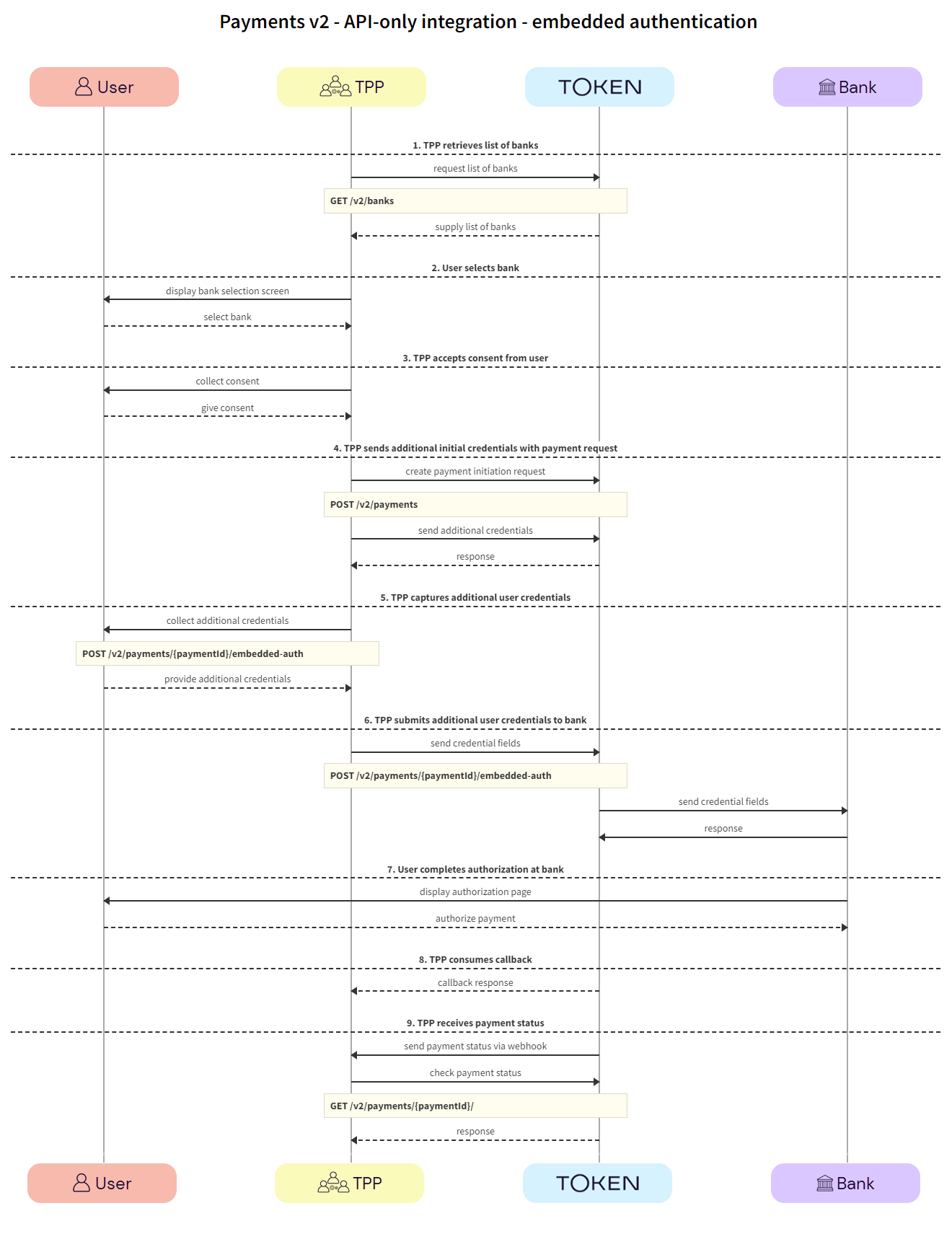 EMBEDDED_HOSTED_PAGES: The TPP owns the user experience including bank selection logic, consent collection, and the initial redirection to the bank. However, complex authentication flows (credentials capture for the embedded SCA flow, decoupled steps, and multiple redirects from the bank) are handled by Token.io’s Hosted Pages. If you are opting for the API-only integration type, we therefore recommend you use EMBEDDED_HOSTED_PAGES for all your Payments v2 requests.