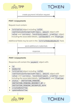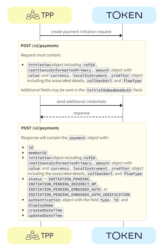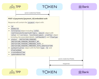 1. TPP -> Token.io - The TPP sends the initial credentials fields with the POST /v2/payments request in the initialEmbeddedAuth field.