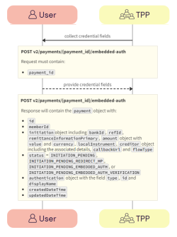 If the payment status is INITIATE_PAYMENT_EMBEDDED_AUTH then the TPP captures additional credentials from the user using the POST v2/payments/{paymentId}/embedded-auth call.