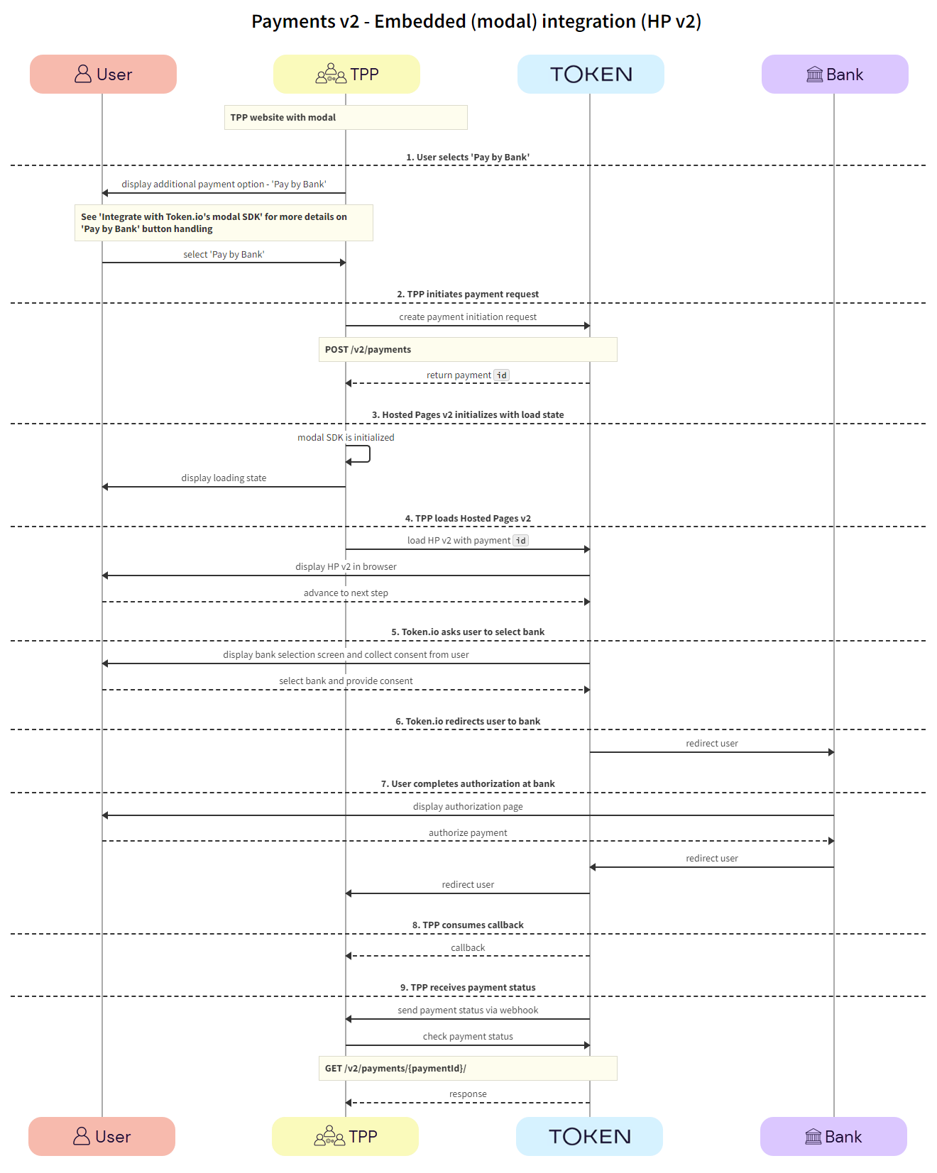 1. TPP -> Token.io - The TPP loads the Hosted Pages in modal SDK using the redirect URL containing the payment id.