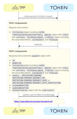 The TPP initiates the payment request with Token.io using the POST /v2/payments call. Token.io responds by acknowledging the details of the request, and providing the details for the next step, which in most cases includes a redirect URL to the bank.
