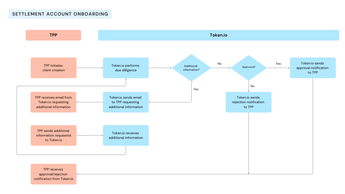 The flow diagram below shows how onboarding will work. Once you're approved, Token.io will notify you so that you can proceed with the next steps for creating the settlement account.