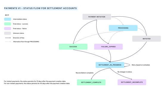 For v1 payments, the INITIATED, SUCCESS and FAILURE_EXPIRED statuses can transition to SETTLEMENT_IN_PROGRESS when using Settlement accounts. From SETTLEMENT_IN_PROGRESS, the status can transition to either SETTLEMENT_COMPLETED or SETTLEMENT_INCOMPLETE.