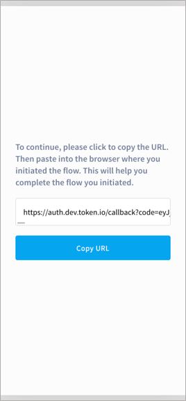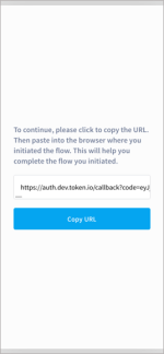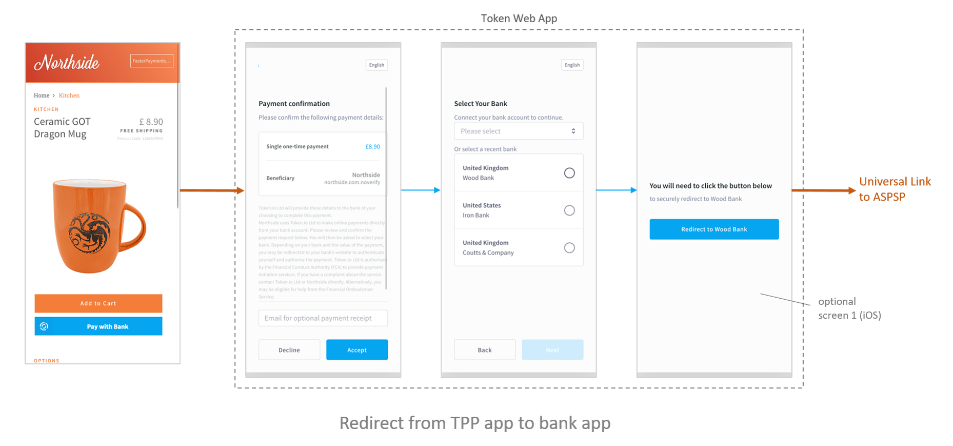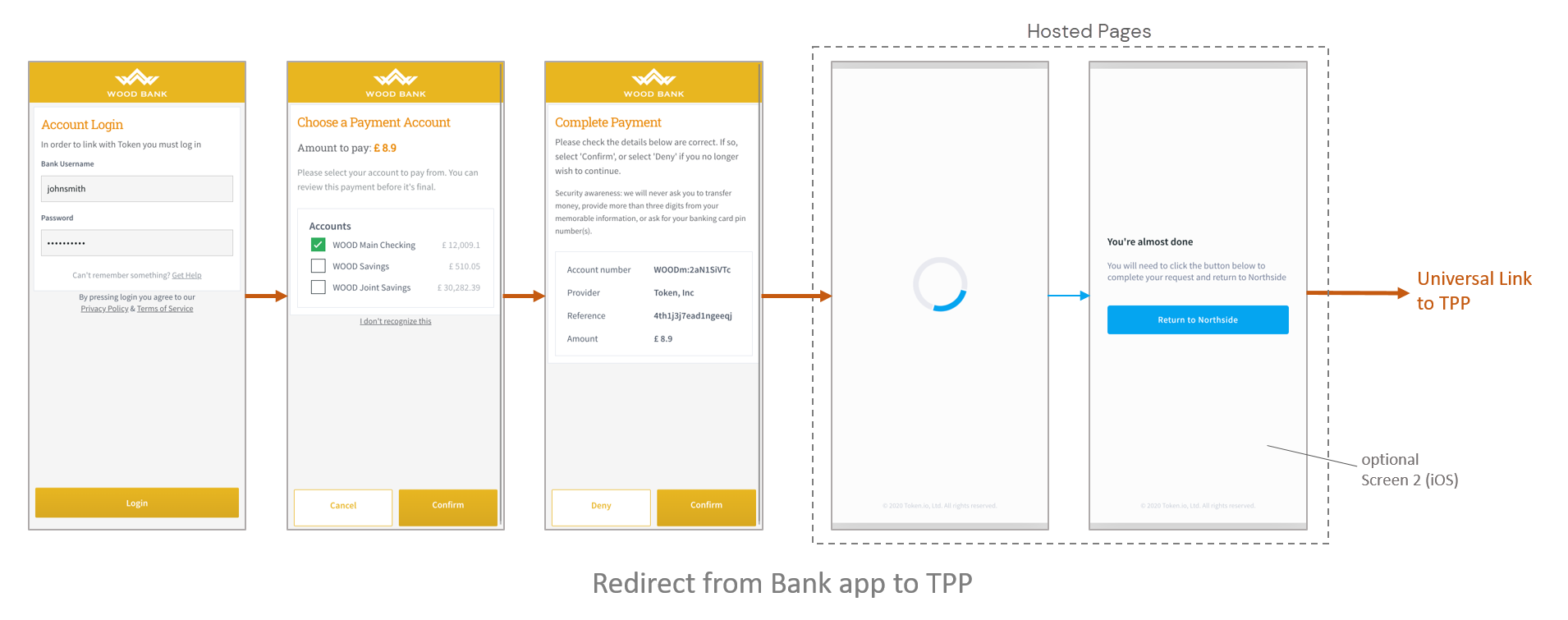 Here, Token.io provides Screen 1 to satisfy the Universal Link policy enforced by iOS on Apple devices. This particular screen is not required for devices running Android.