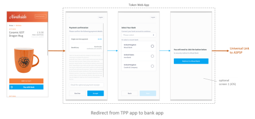 The general idea (pictured above, click to enlarge) doesn't include enforcing SCA and then securely redirecting the user back to the TPP app to initiate token redemption. The security aspects required for PSD2 compliance require a few more steps, as you'll see in the more detailed discussion of Token.io's app-to-app redirect feature.