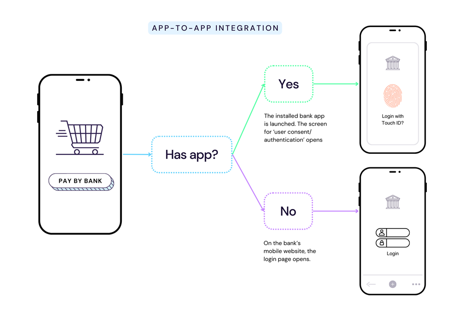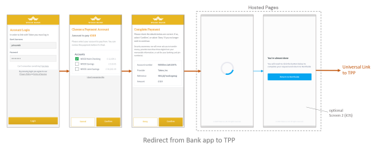 As defined by OBIE/PSD2 , an app-to-app redirect allows the TPP to redirect a PSU from the TPP application (in a mobile web browser or mobile app) to the bank's (ASPSP) mobile app, when the latter is installed on the PSU's device. The TPP transmits details of the request (account information or payment) along with the PSU's preferences (e.g., product type, one-step authentication) through the respective Universal Link (iOS) or App Link (Android) and redirects the PSU to the bank app's login screen or function. The PSU then provides consent and is authenticated by the banking app using the same credentials/methods normally used when the PSU directly accesses the account using the bank app (typically, biometric).