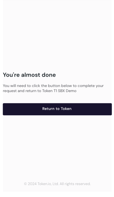 1. "source=app" – This option also ensures that the OS honours the deep link when using app-to-app, but at the end of the payment flow instead of between the accept consent and the redirect as in 2a. In this scenario, when the user returns from the bank to Token.io's HP, the following screen is shown.